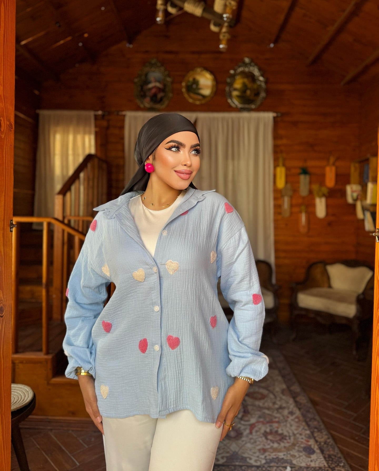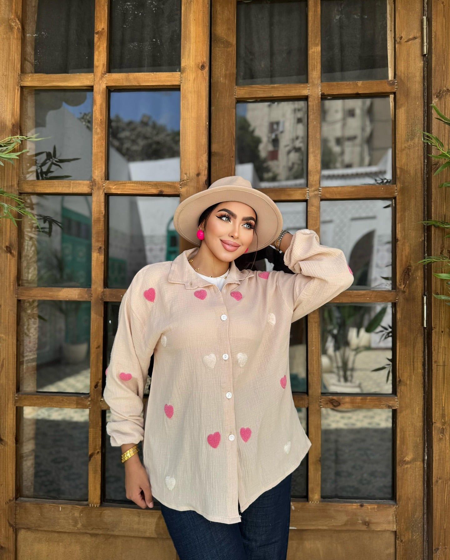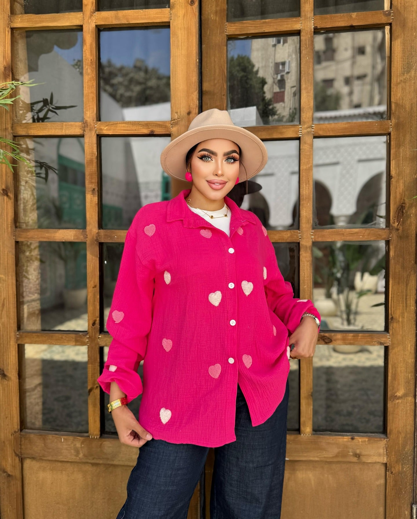 أضيفي لمسة من الحيوية والأنوثة لإطلالتك مع هذه القميصة المميّزة بتفاصيل القلوب الناعمة. تصميم واسع ومريح يمنحك حرية الحركة، ومثالي للإطلالات اليومية الكاجوال أو الستايل العصري البسيط.
