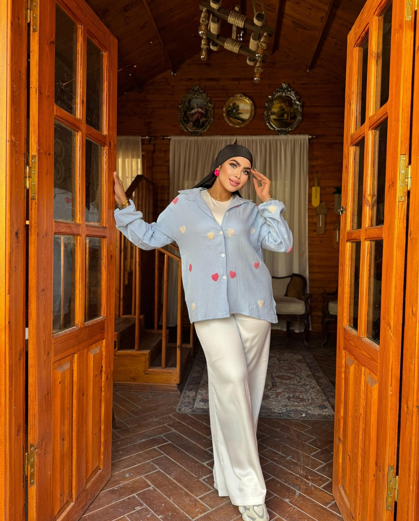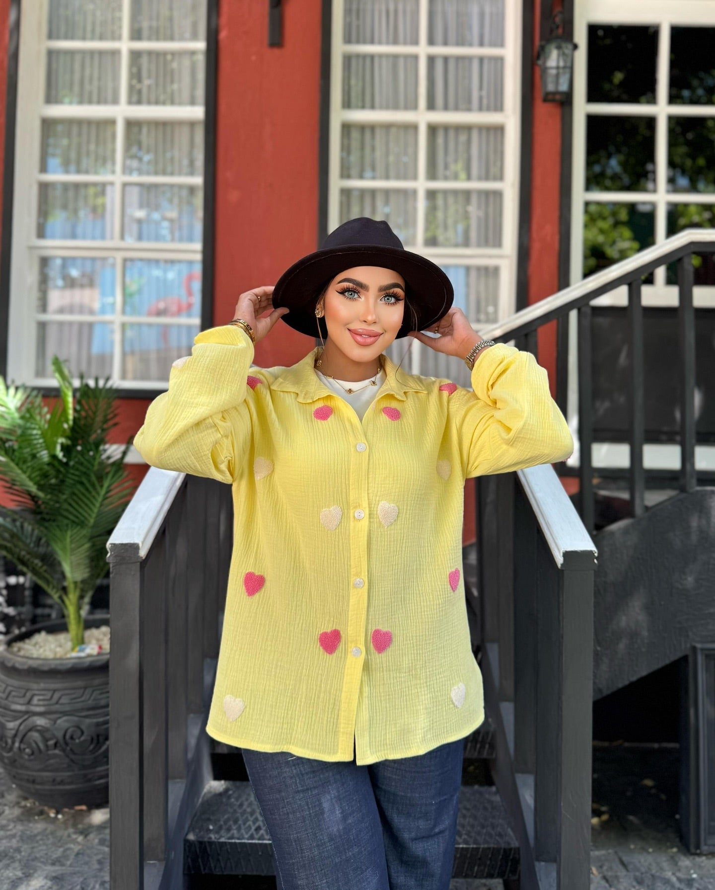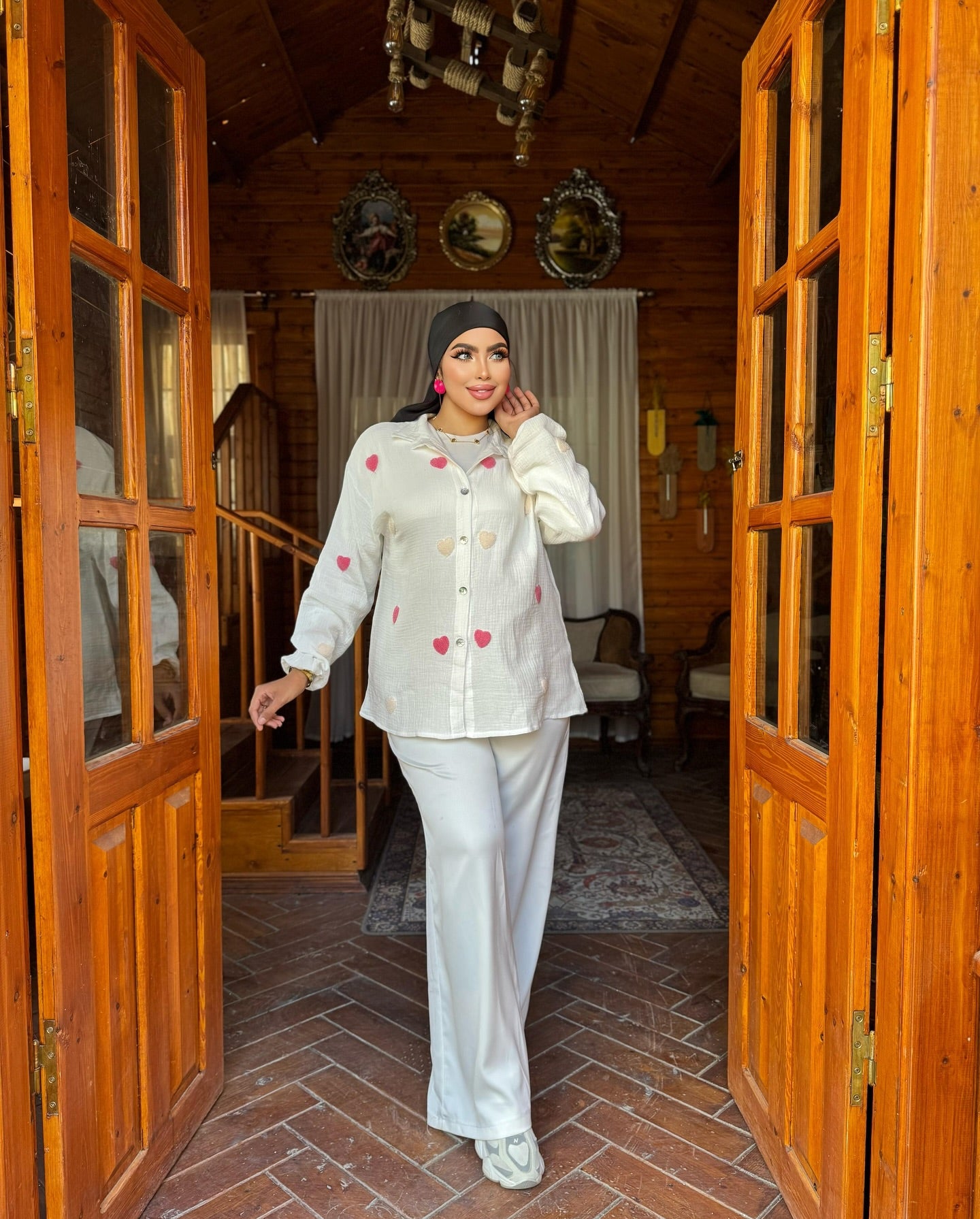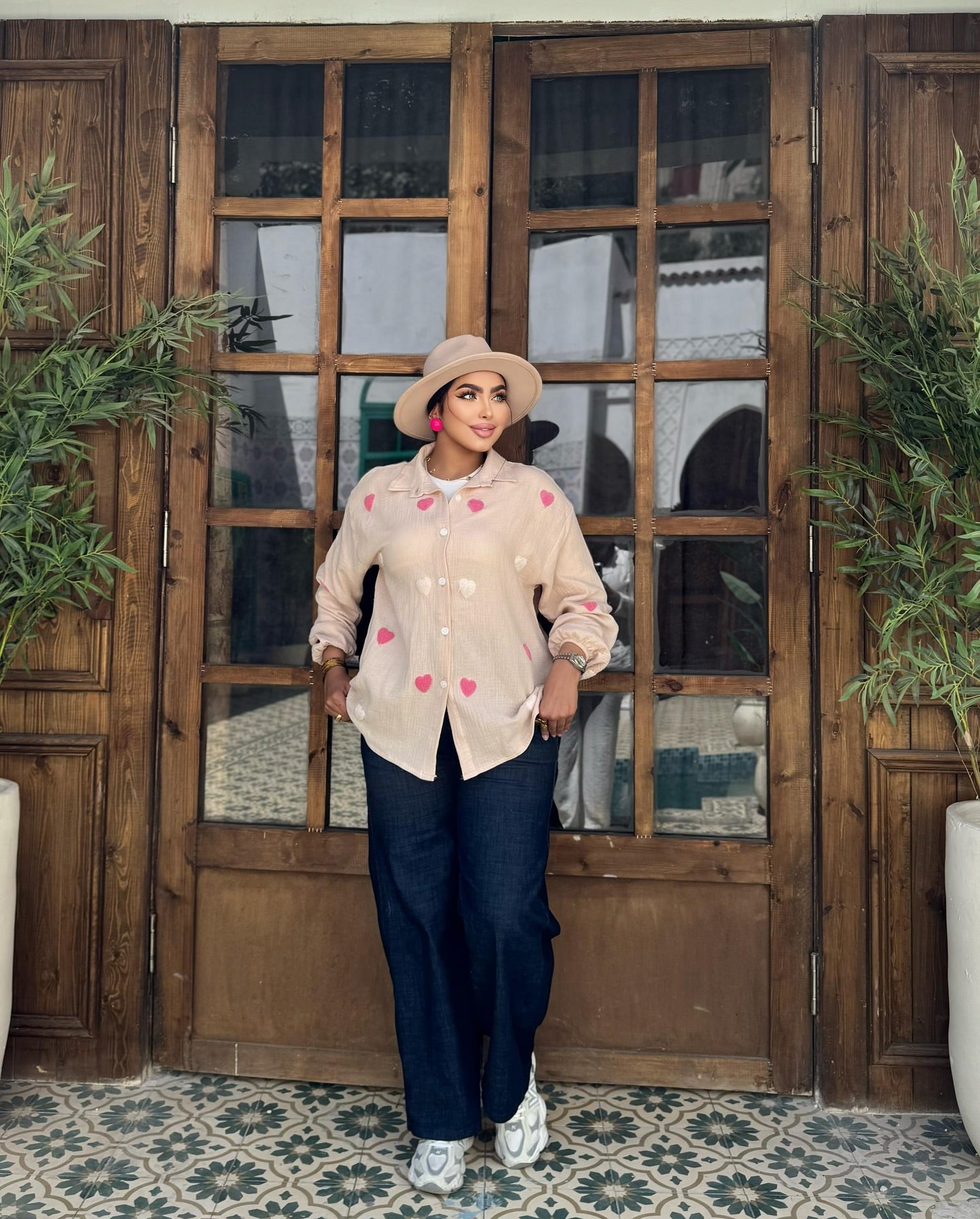 أضيفي لمسة من الحيوية والأنوثة لإطلالتك مع هذه القميصة المميّزة بتفاصيل القلوب الناعمة. تصميم واسع ومريح يمنحك حرية الحركة، ومثالي للإطلالات اليومية الكاجوال أو الستايل العصري البسيط.