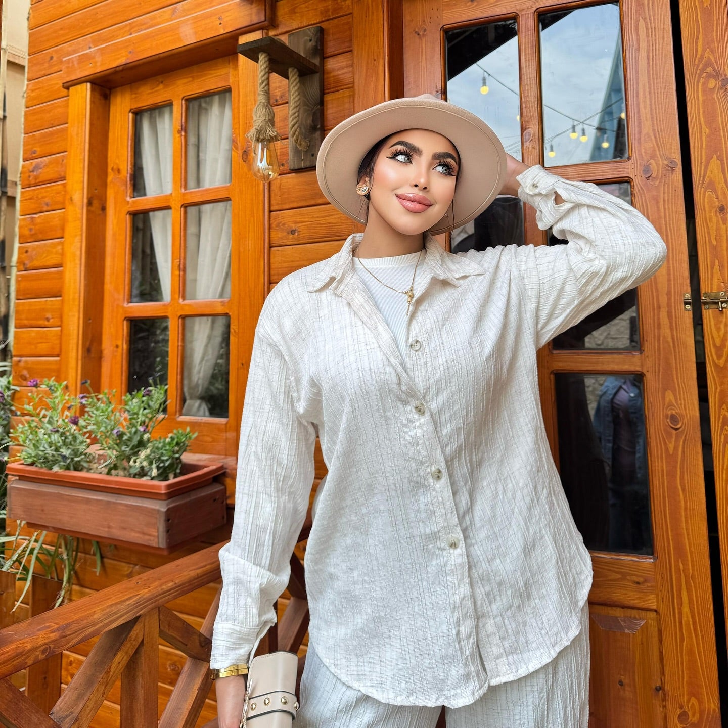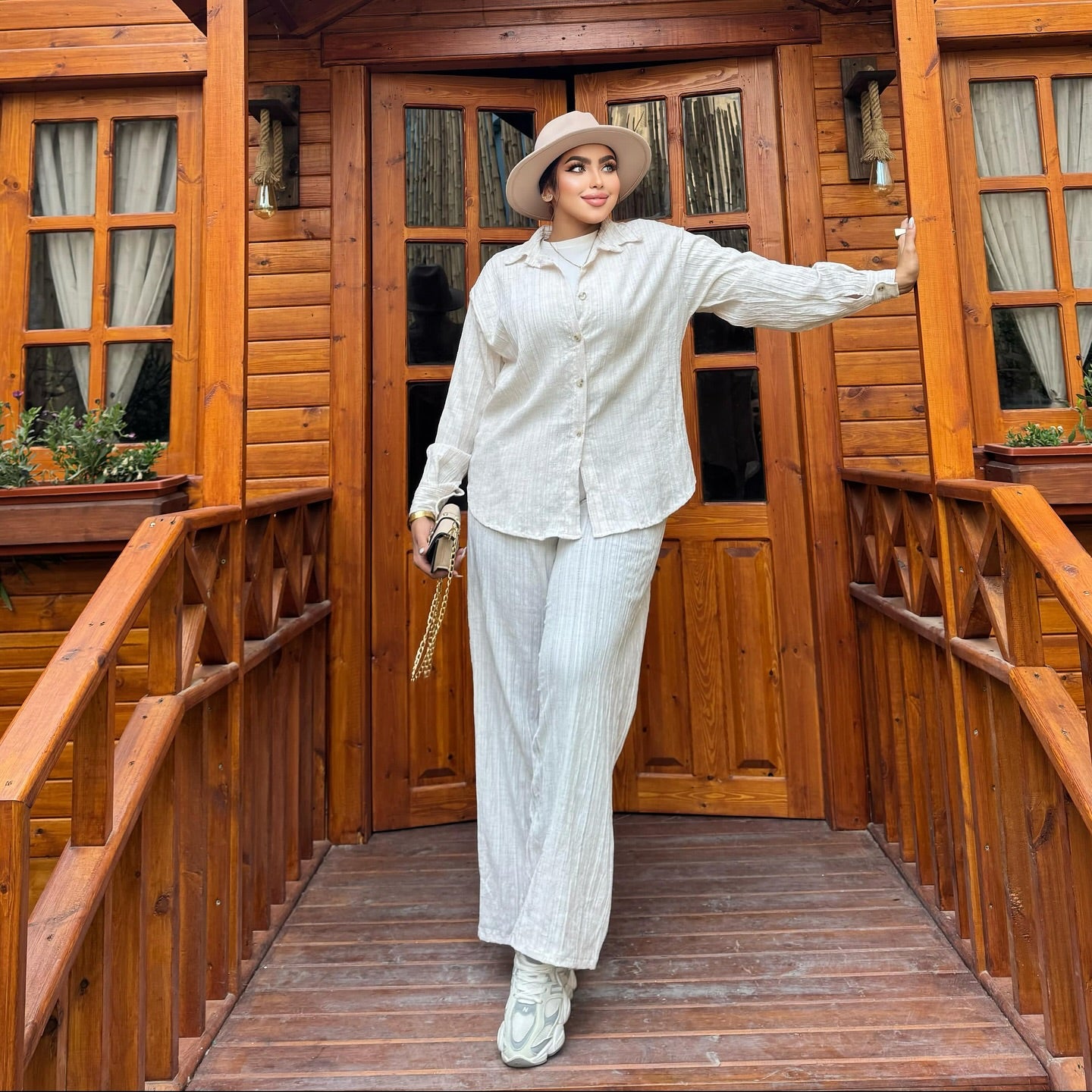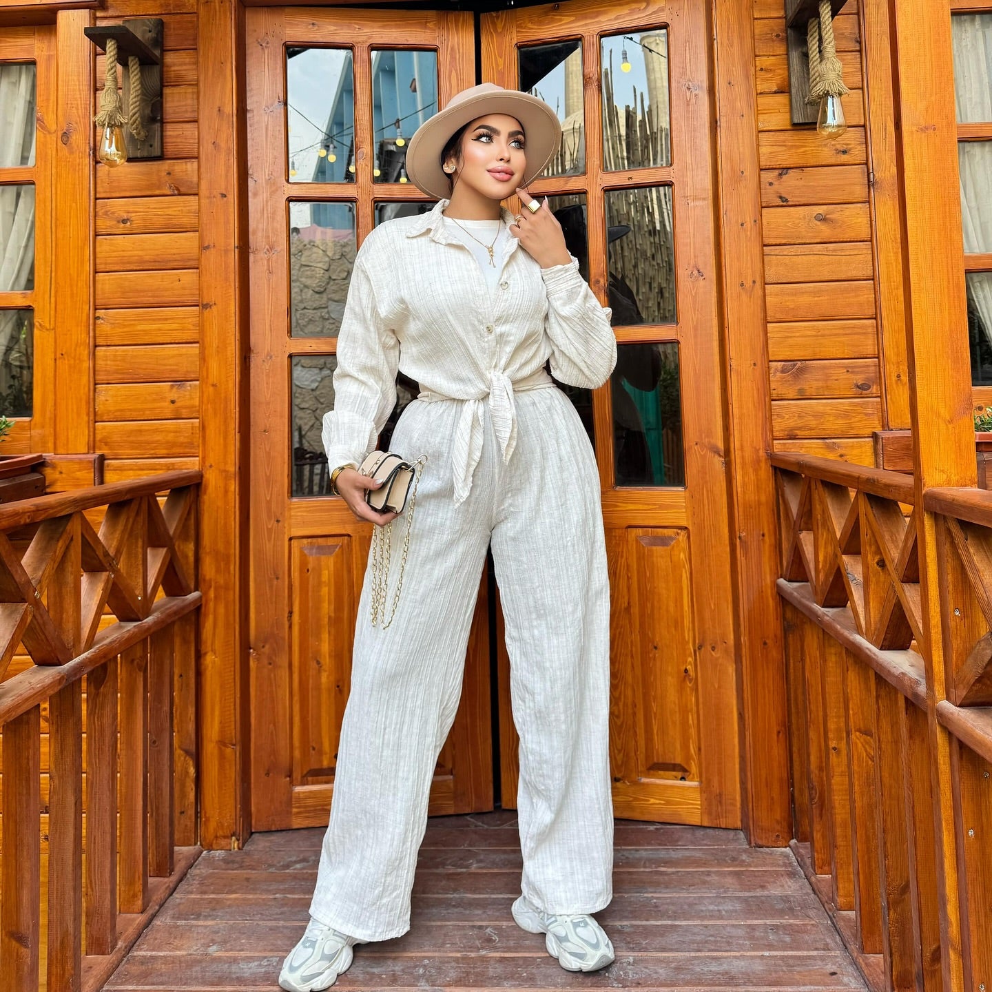 تميّزي بإطلالة أنيقة وبسيطة مع هذا الطقم العصري بلونه الهادئ وتصميمه المريح. القماش الخفيف يمنحك شعوراً بالراحة طوال اليوم، بينما يضيف الحزام على الخصر لمسة أنثوية رقيقة تُبرز جمال القَصّة. مناسب للمشاوير اليومية والإطلالات الكاجوال الأنيقة.