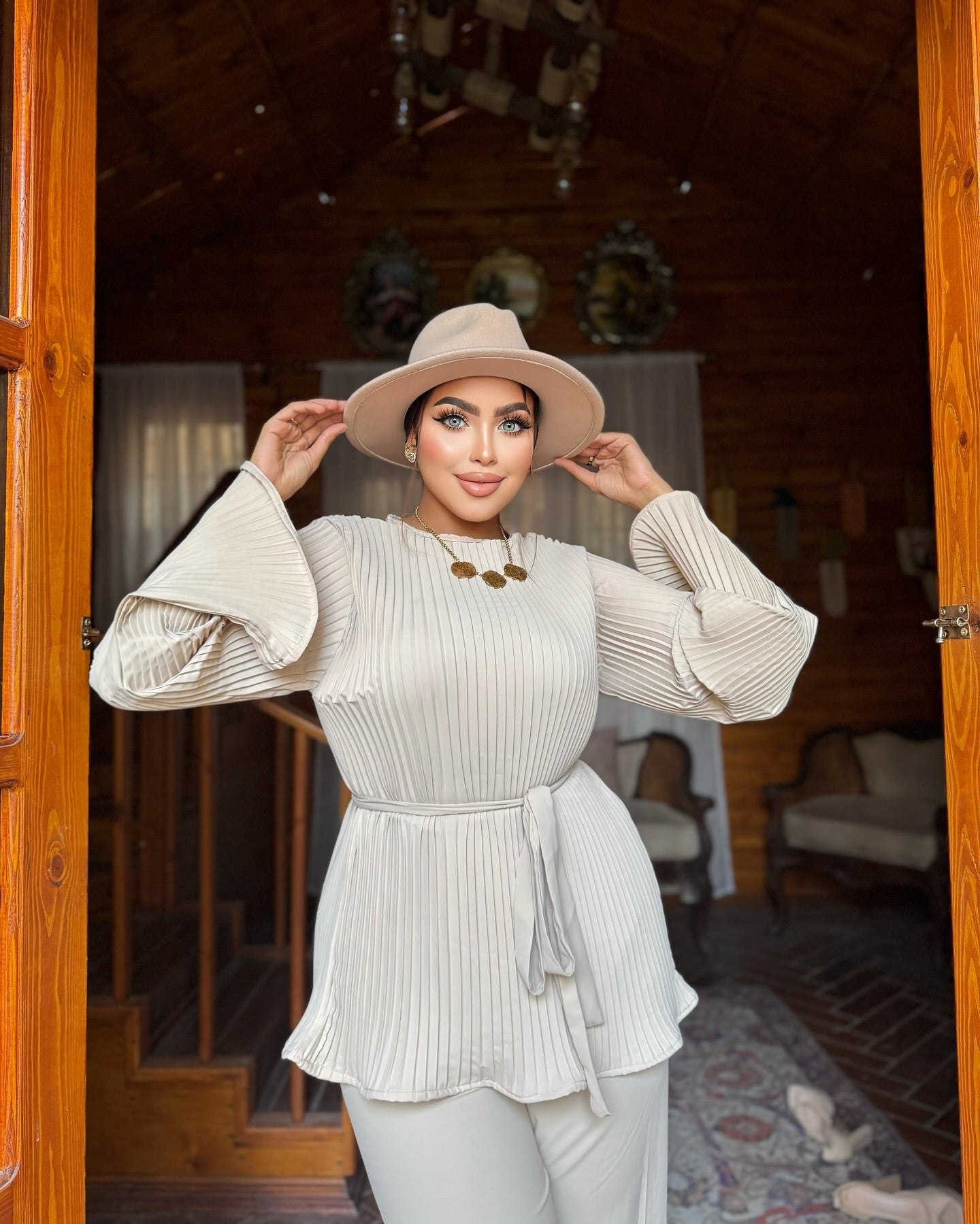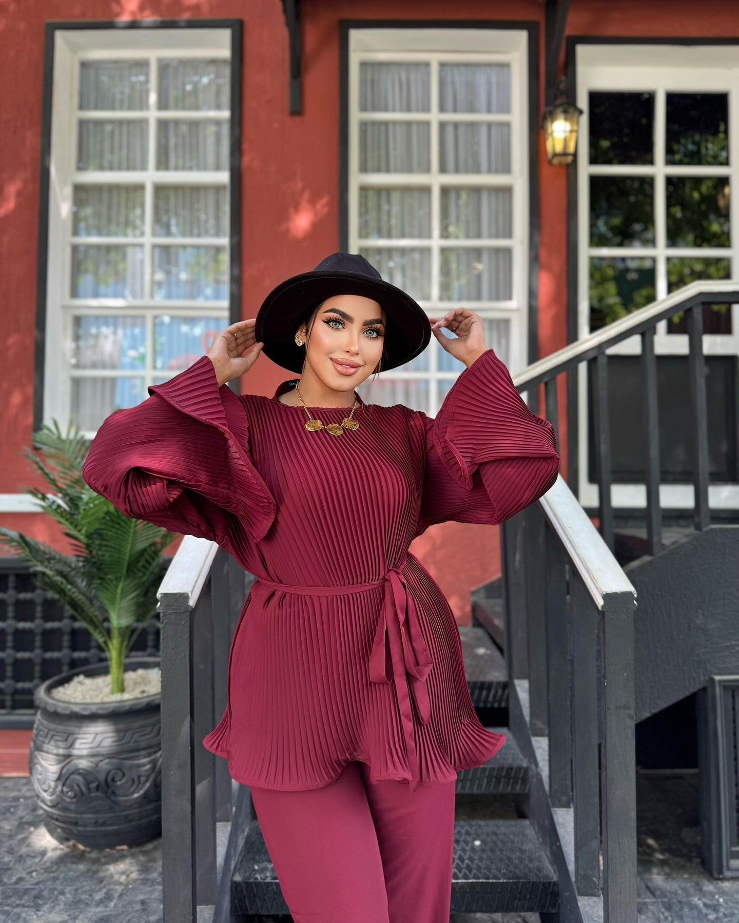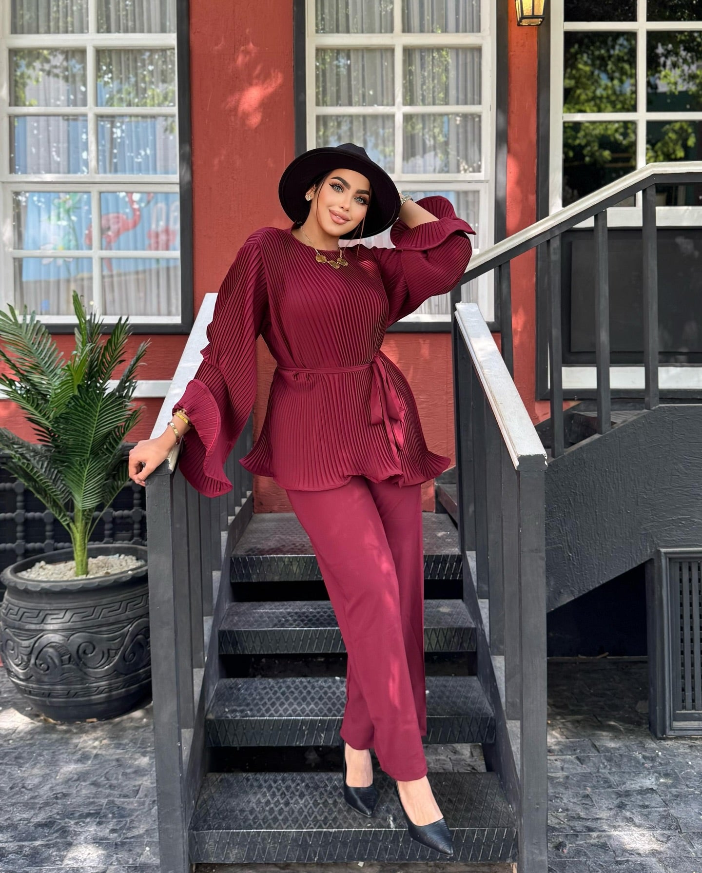 طقم نسائي مكون من بلوزة بتصميم بليسيه عصري مع حزام خصر يبرز أنوثتك، وبنطال مريح بقصّة مستقيمة تمنحك أناقة لا مثيل لها.