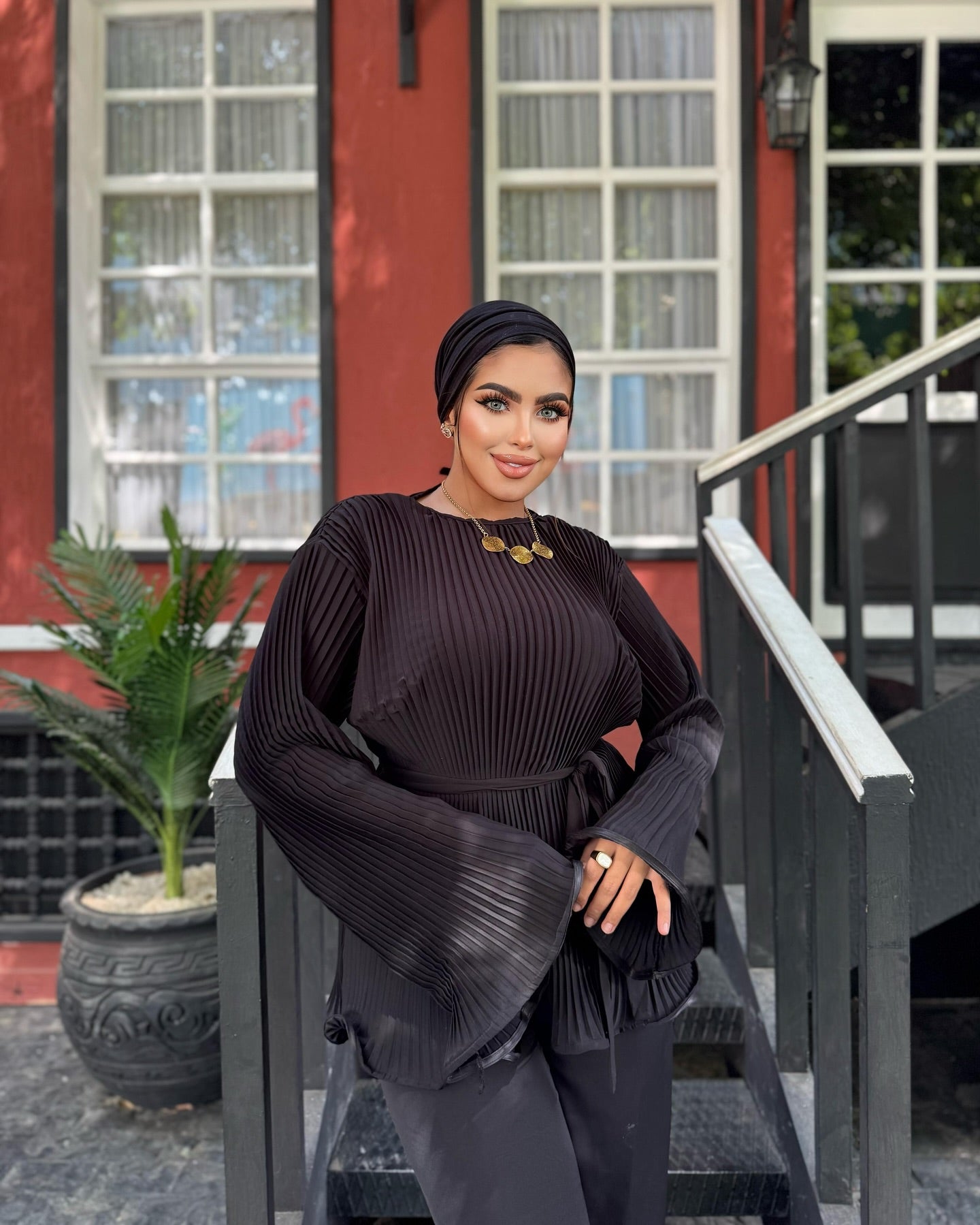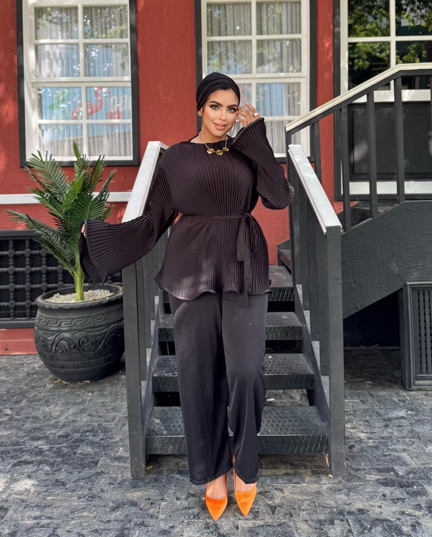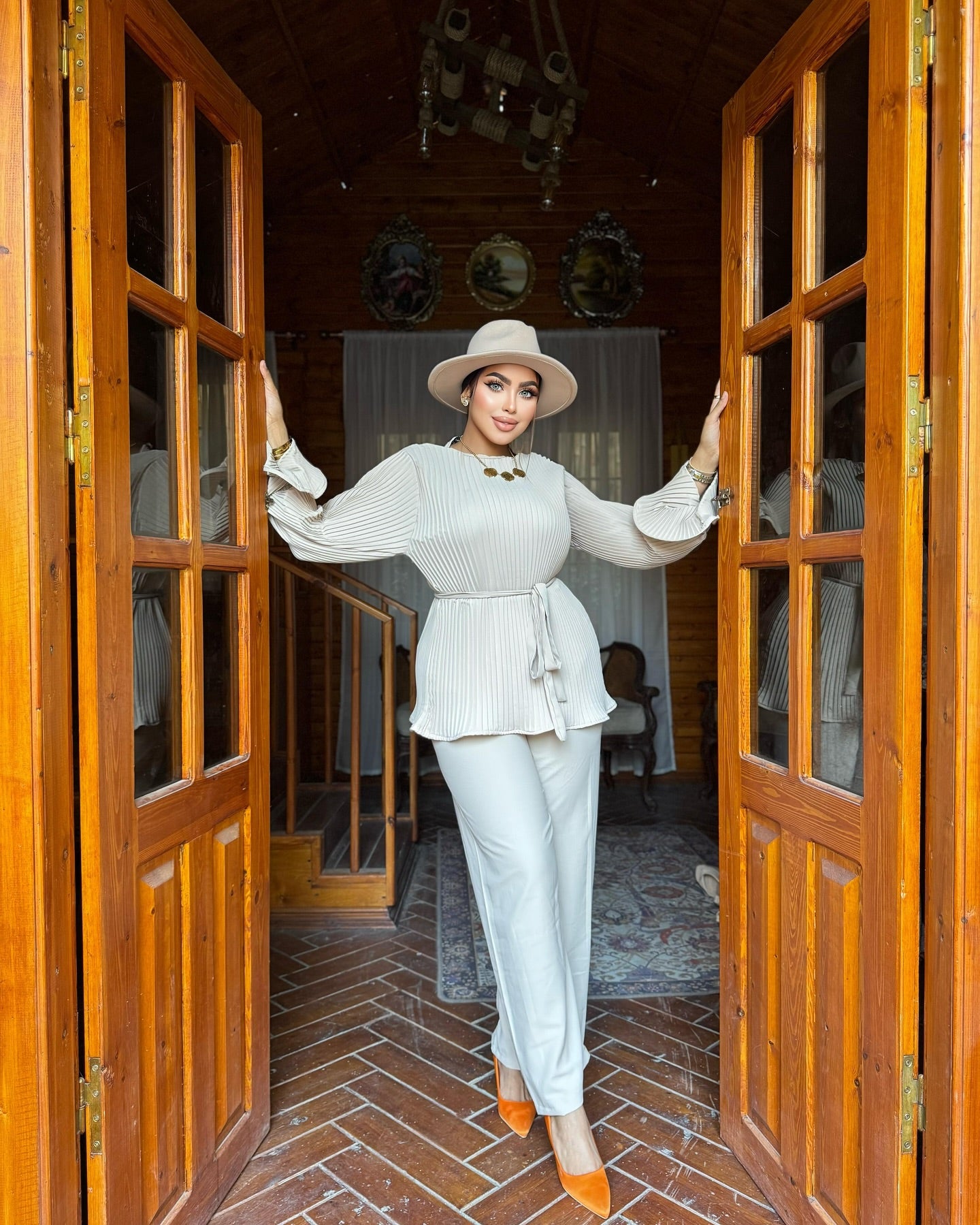 طقم نسائي مكون من بلوزة بتصميم بليسيه عصري مع حزام خصر يبرز أنوثتك، وبنطال مريح بقصّة مستقيمة تمنحك أناقة لا مثيل لها.